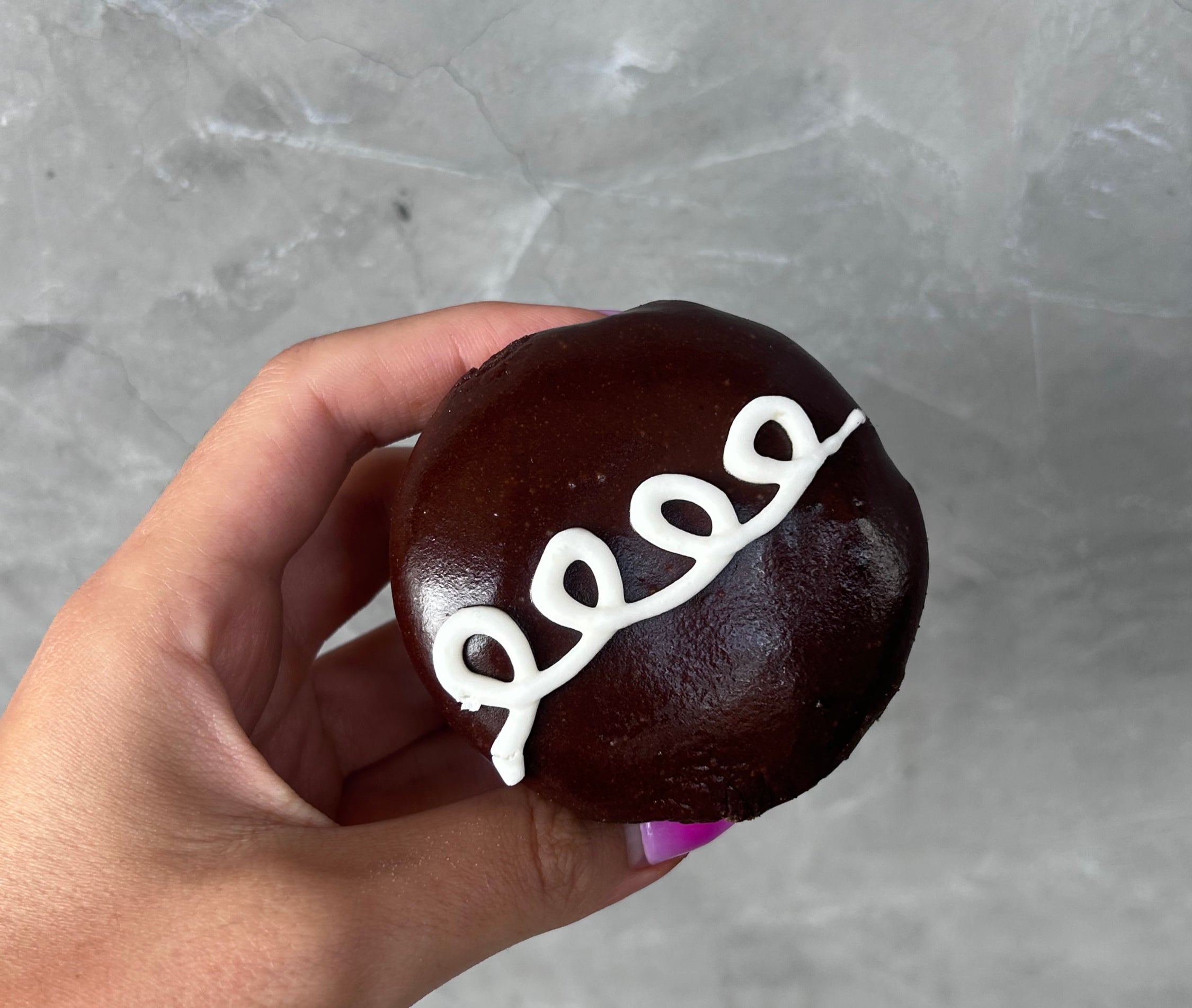 Pingüino keto, hecho con harina de almendra, endulzado con monkfruit, relleno sin azúcar y cubierto de chocolate sugar free.
